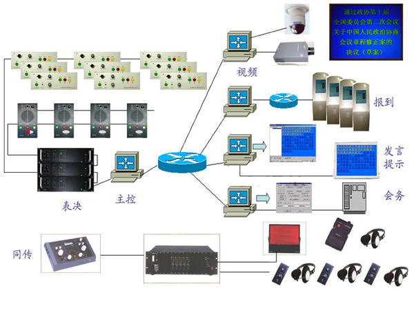 其它的辅助设备还包括扬声器和公共显示装置,用以显示投票结果(以字符显示和图形显示方式)、信息(如通道/语种的分配)和话筒状态资料等。在客座演讲台上装备了嵌入式话筒,扬声器,通道选择器和耳机。在系统PC机上运行的软件模块一般包括以下: