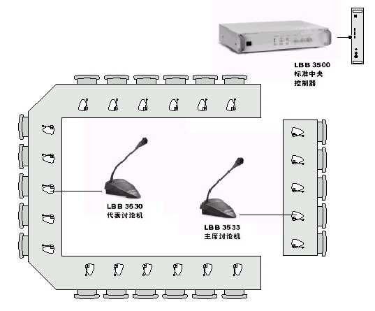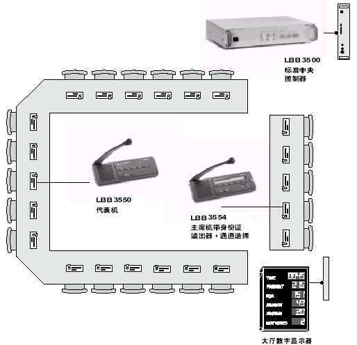 本例中显示的讨论形式是典型的地方议会或董事会的形式,这种会议要求有正规化的机构,需要迅速,有效地作出决定,因此系统应具备自动表决功能。LBB 3500/00标准CCU以独立会议控制系统的形式使用。提供表决功能,话筒管理,并为所有发言设备提供电源。会议主席掌握会议并控制会议的进程。配备了一台LBB3554/00主席机,机上的LCD显示向主席机提供发言人资料,表决结果,并说明机上的软触键的功能。机上还有话筒优先权控制器,用它可以发起,停止,中止表决,并改变代表话筒的优先地位。