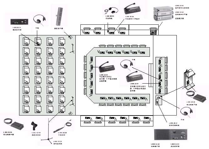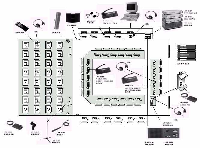 这是小型国际会议的典型情况:有多国代表参加会议,没有通用的语种。会议参加人数多于例2,必须增设同声传译和个人资料显示等功能才能达到会议的要求。全部功能仍能由LBB3500/00型标准CCU从容地控制,所以不必用系统机务员。